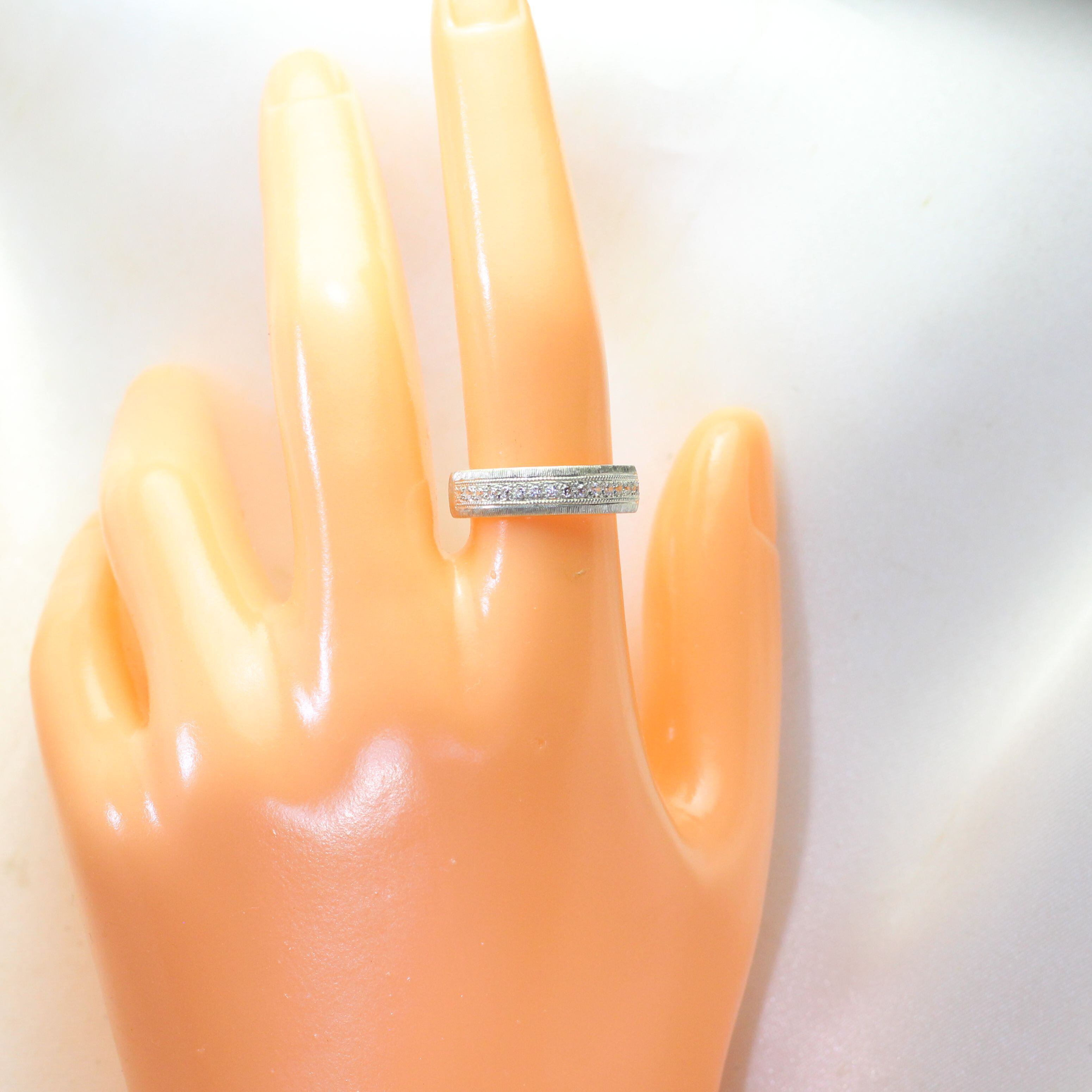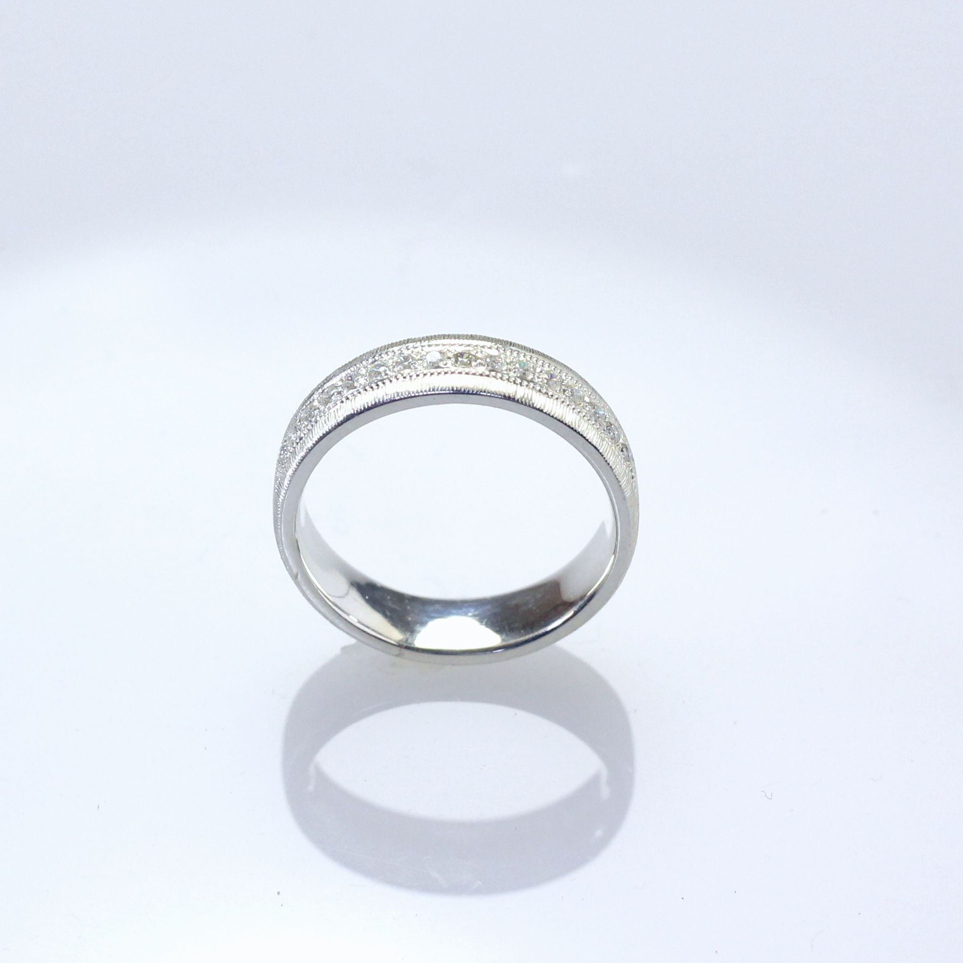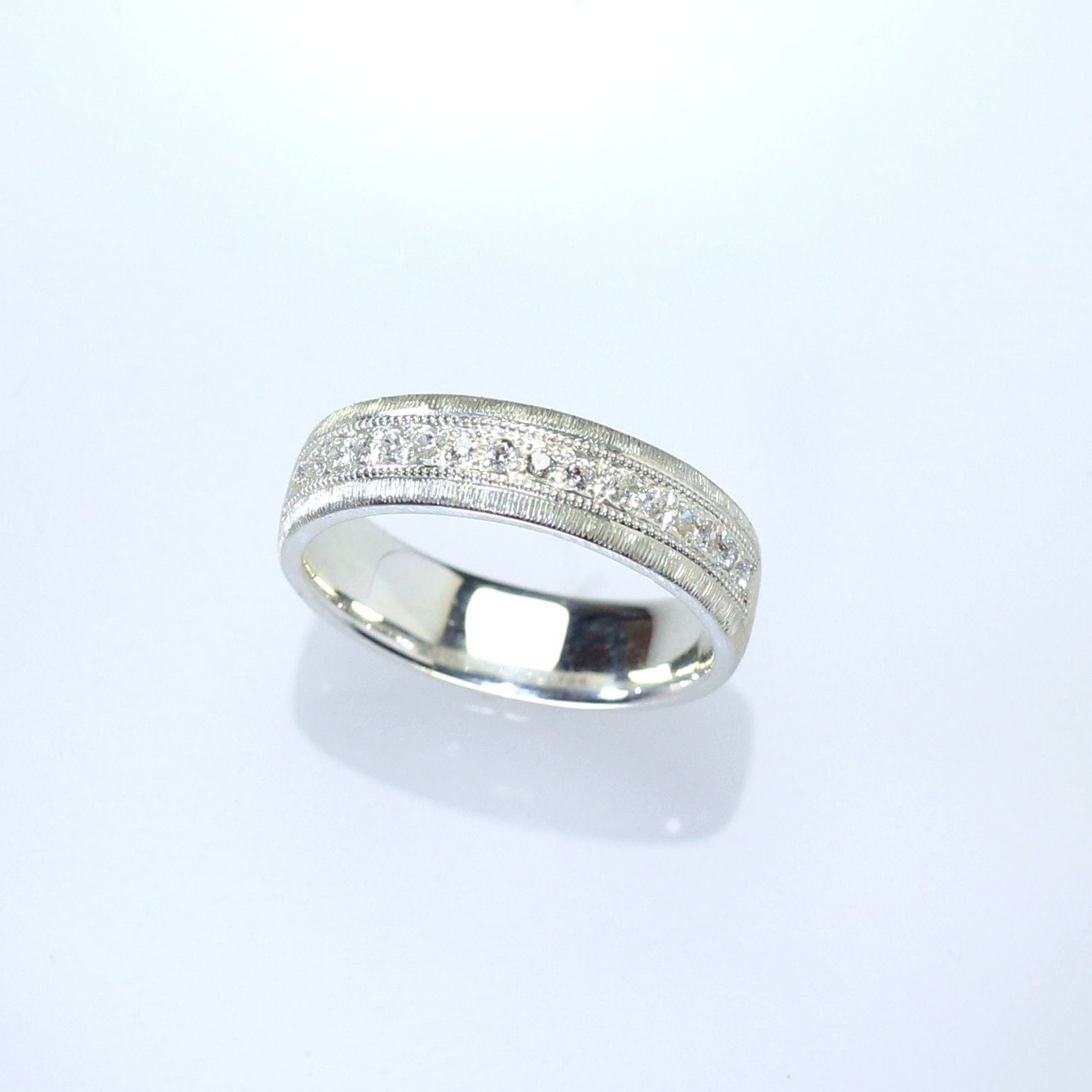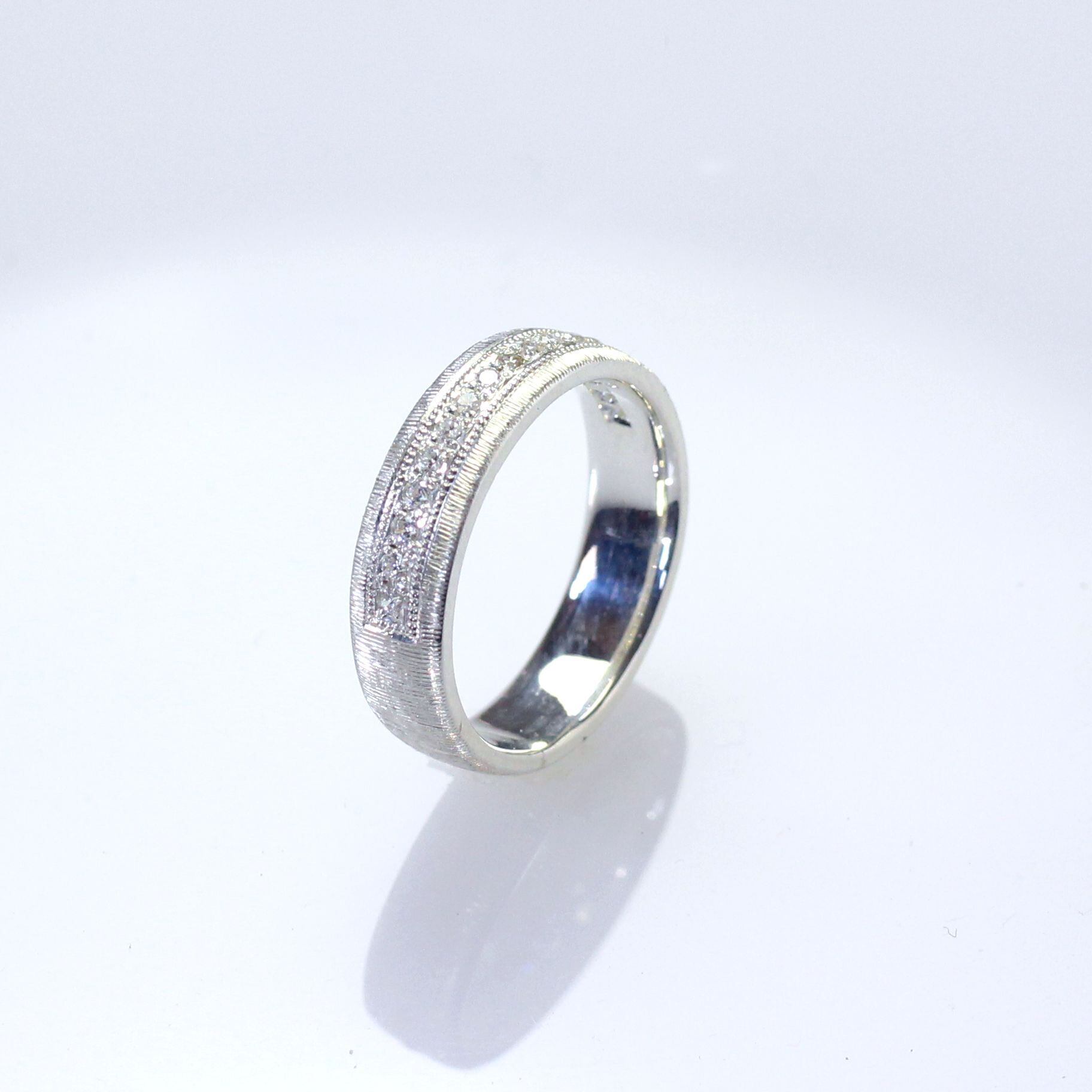 整然と並べられたダイヤモンドと周囲を取り囲むミル打ち細工、全体にはイタリアンジュエリーでよく見られるインチジオーネ(洋彫り)で仕上げた指輪です。
