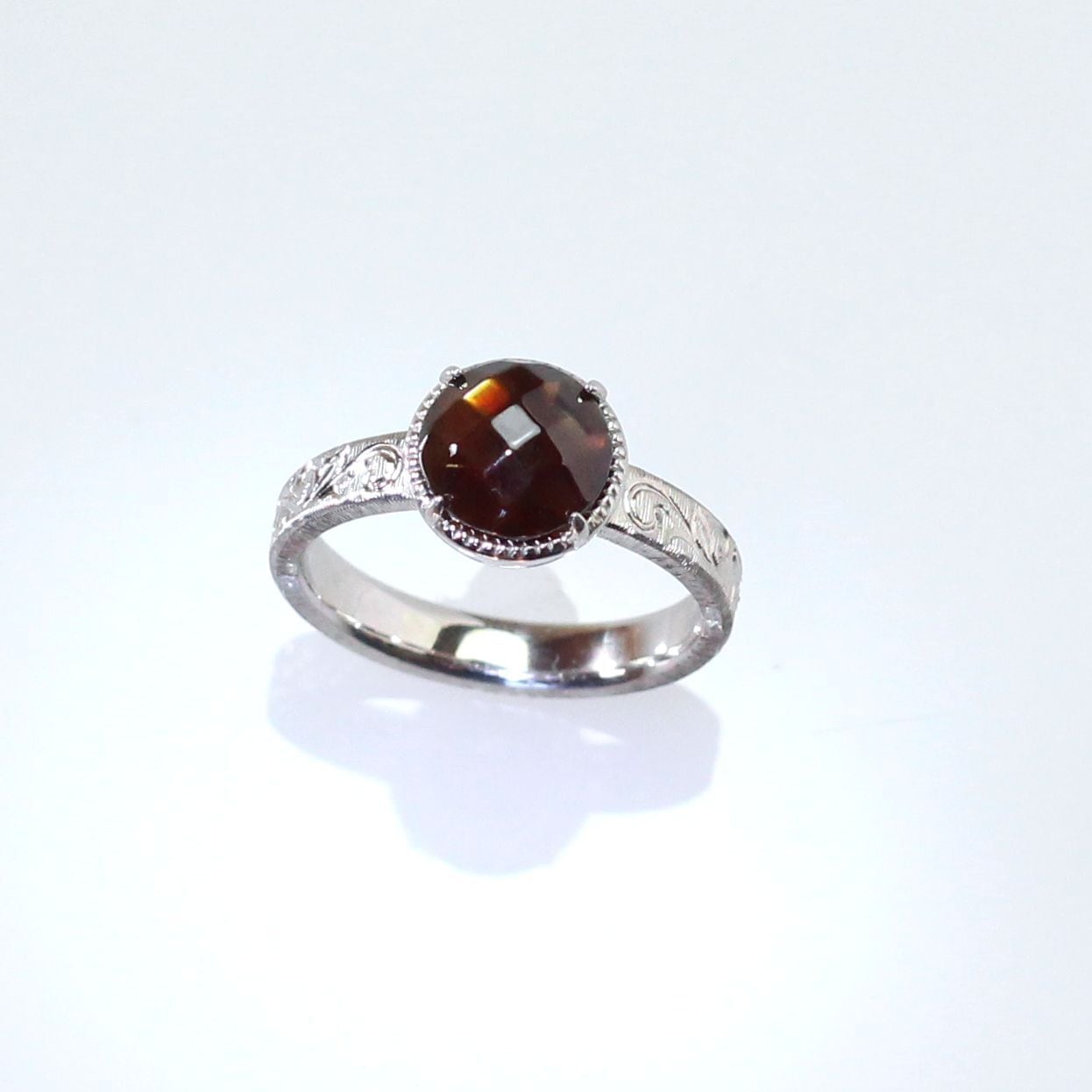 プラチナ枠にはミル打ちや深さの異なる緻密な彫り細工を施し、手作りならではのクオリティーとなっております。