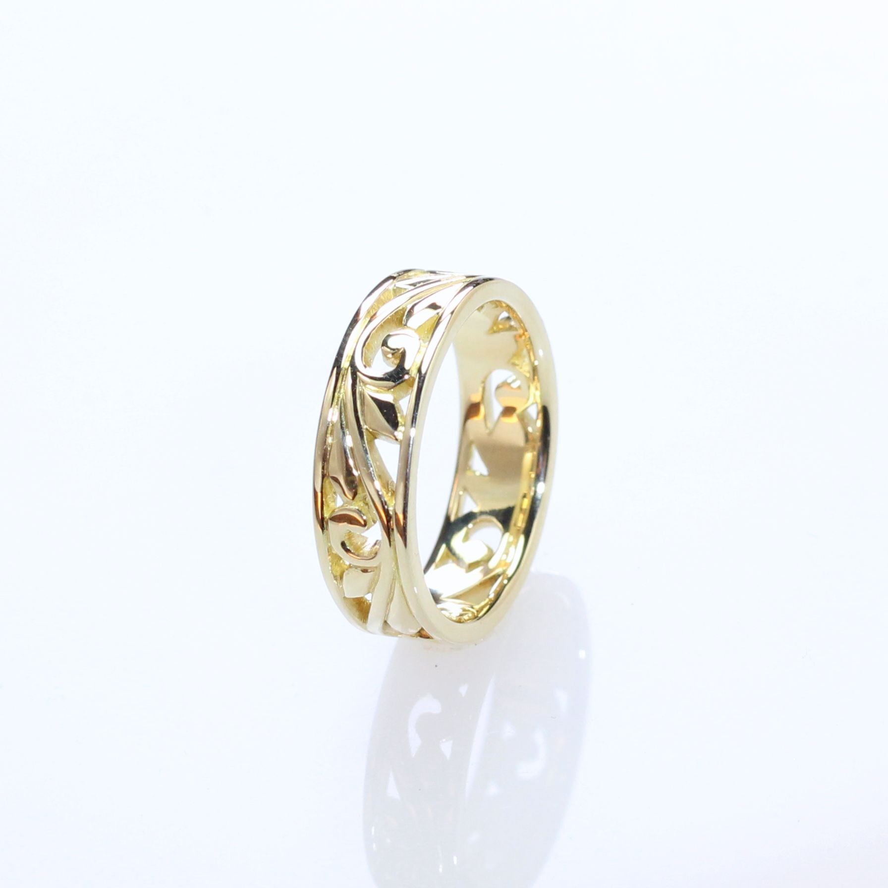 ゴールドの重厚感と流れるような装飾の軽やかさを味わえるラグジュアリーな指輪になります。