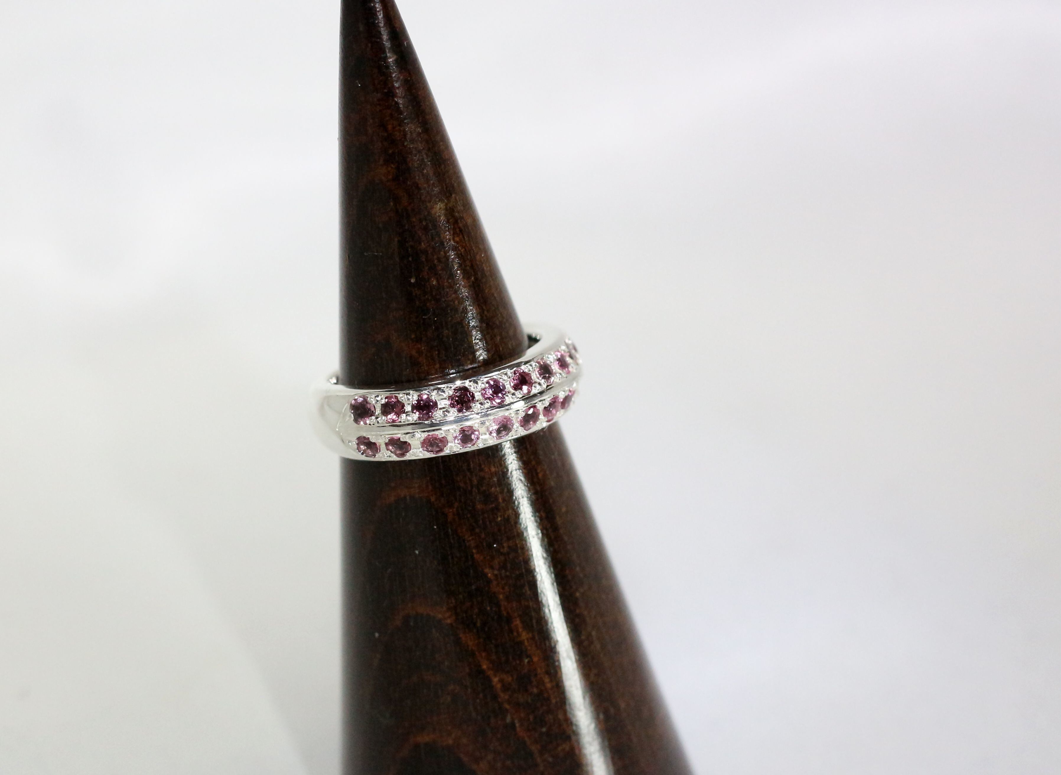 やや紫がかった赤色をもち、気品を感じさせる小さな宝石を散りばめたリングになります。