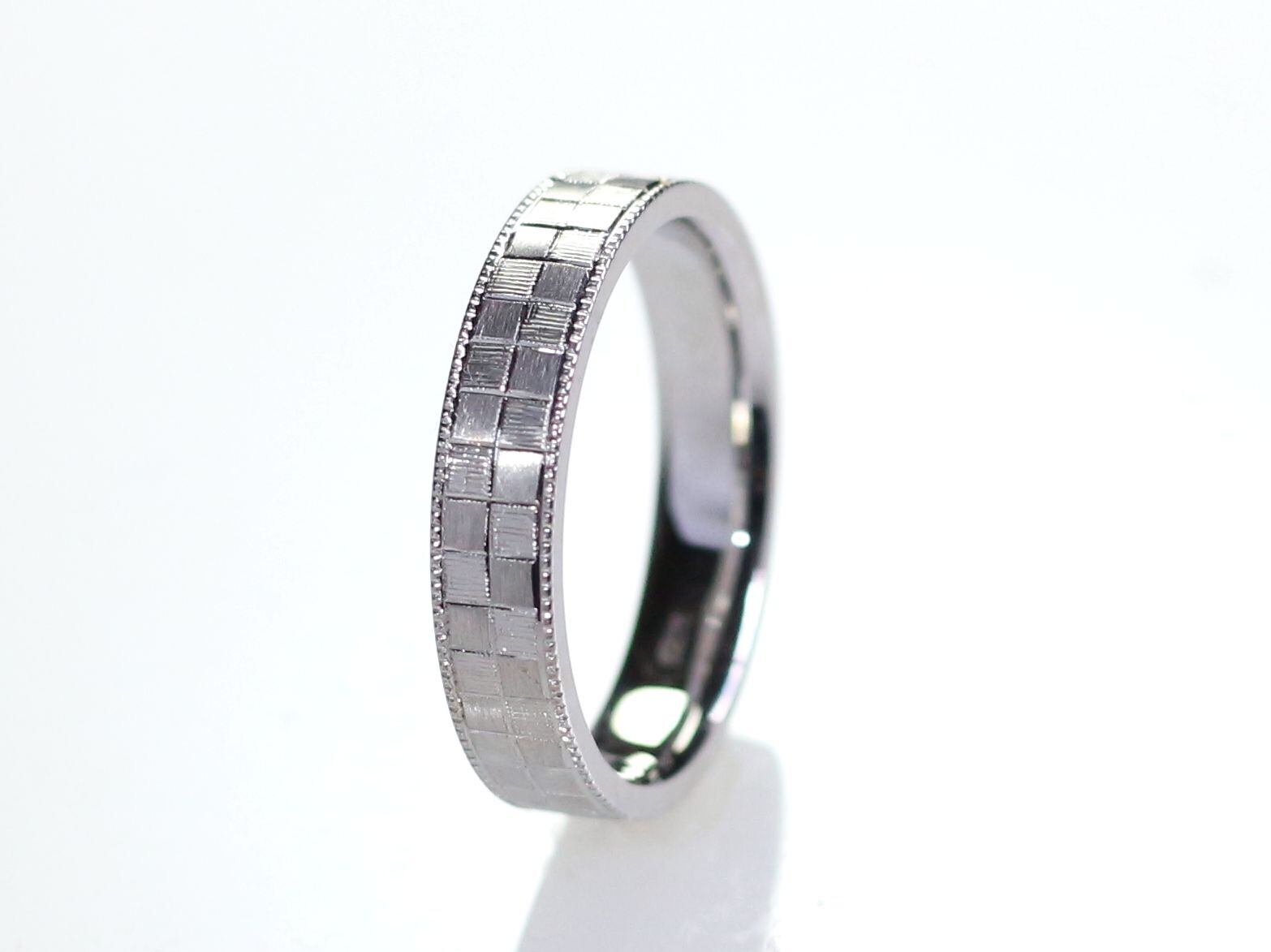 鏨による彫り細工とミル打ちが一周入った指輪になります。