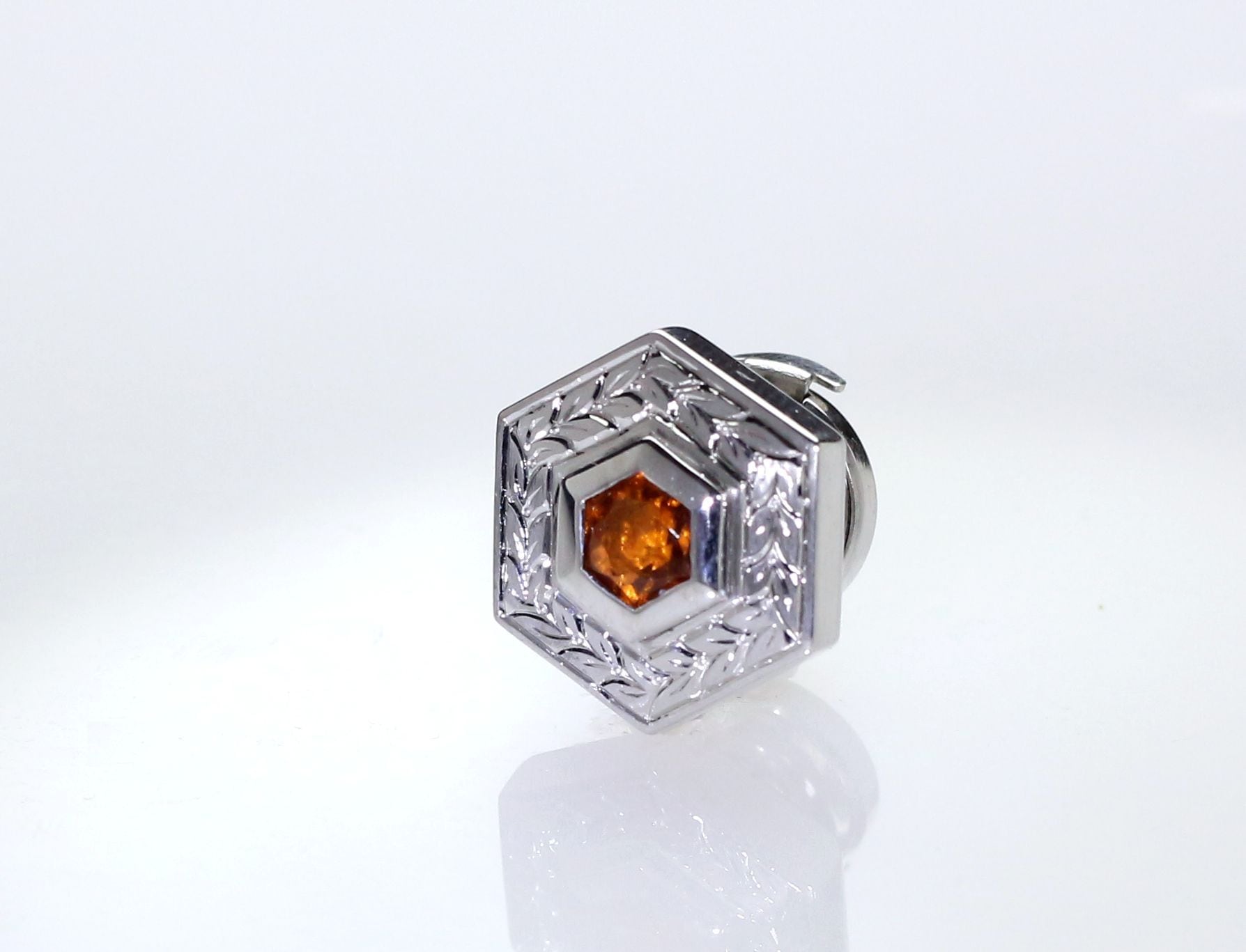 六角形のルースに合わせシルバー枠も六角形に、表面には月桂樹の彫り模様を施し仕上げました。