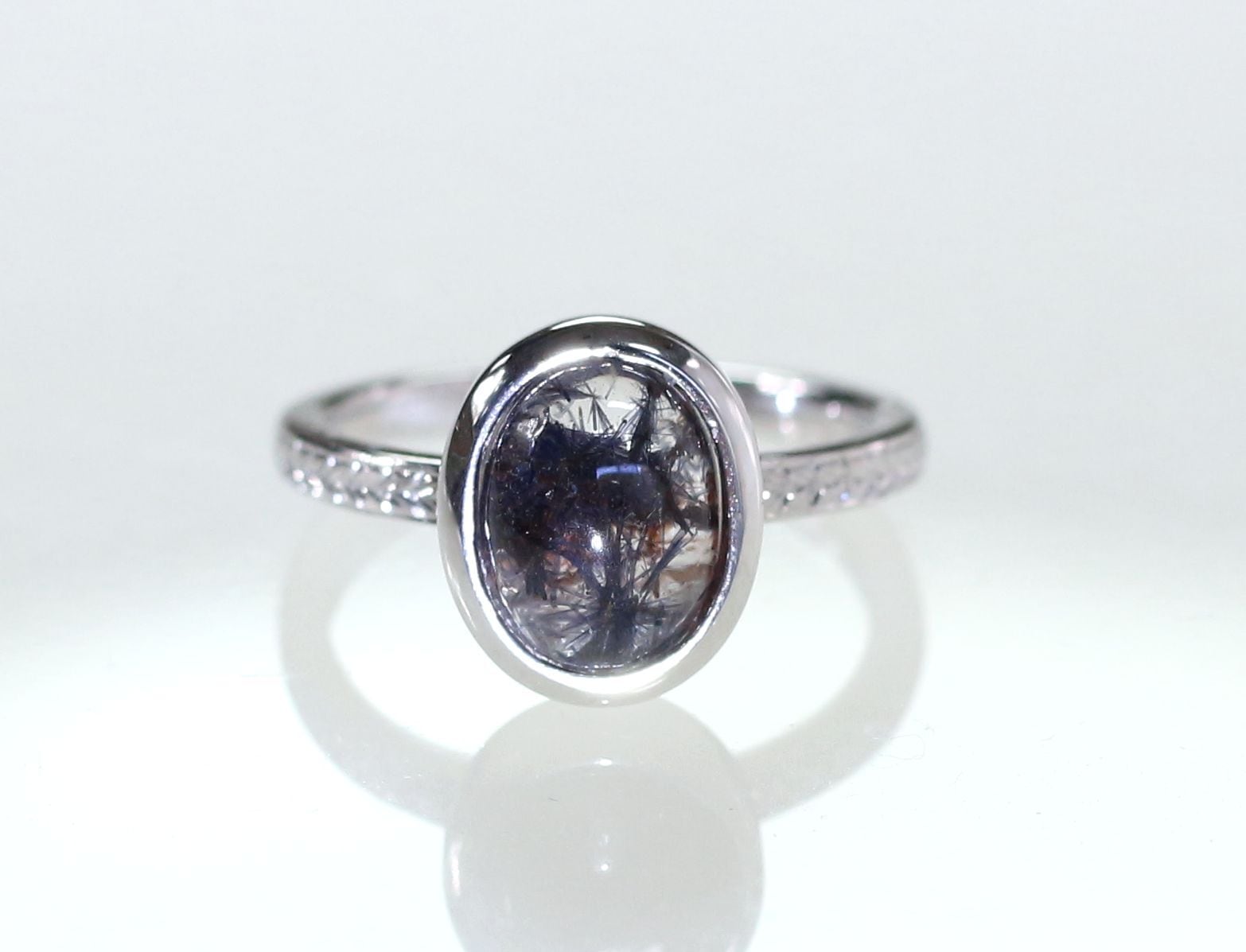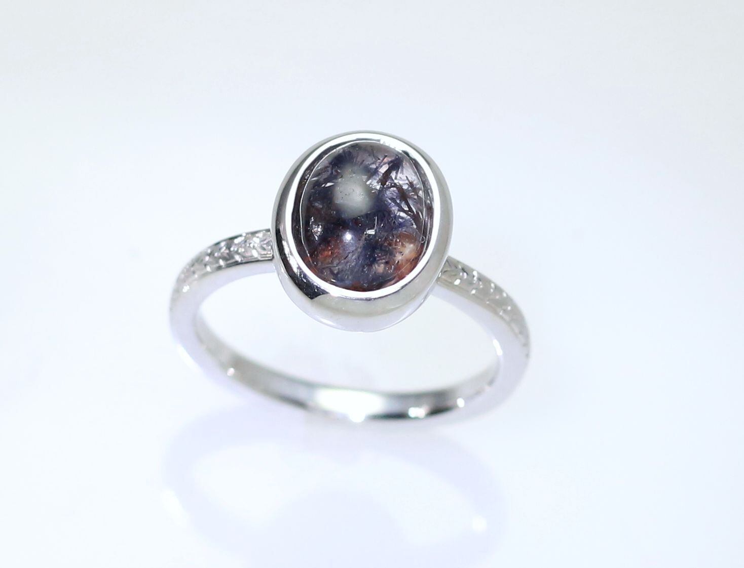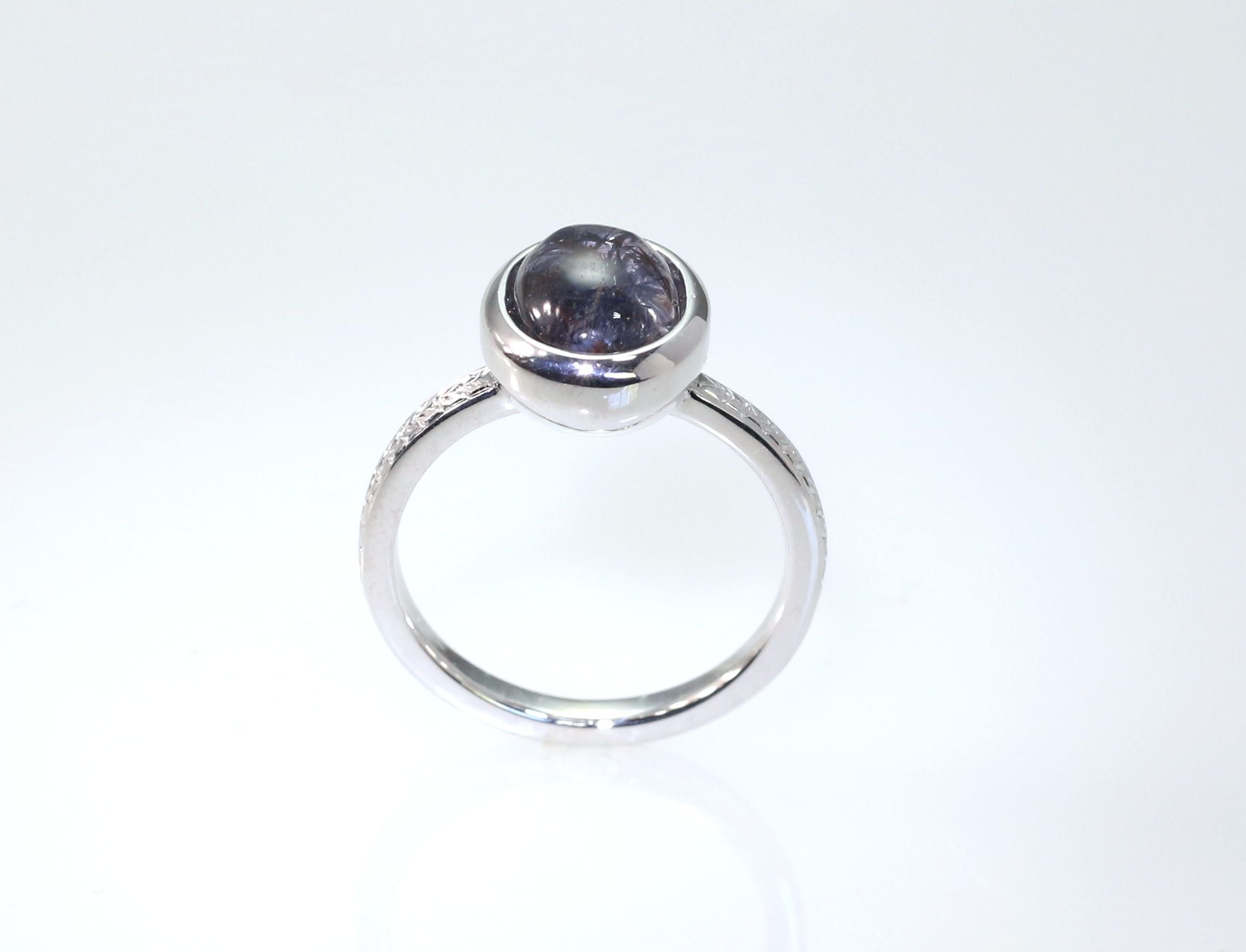 この指輪にセットしているデュモルチェライトは一般的な物より濃紺。